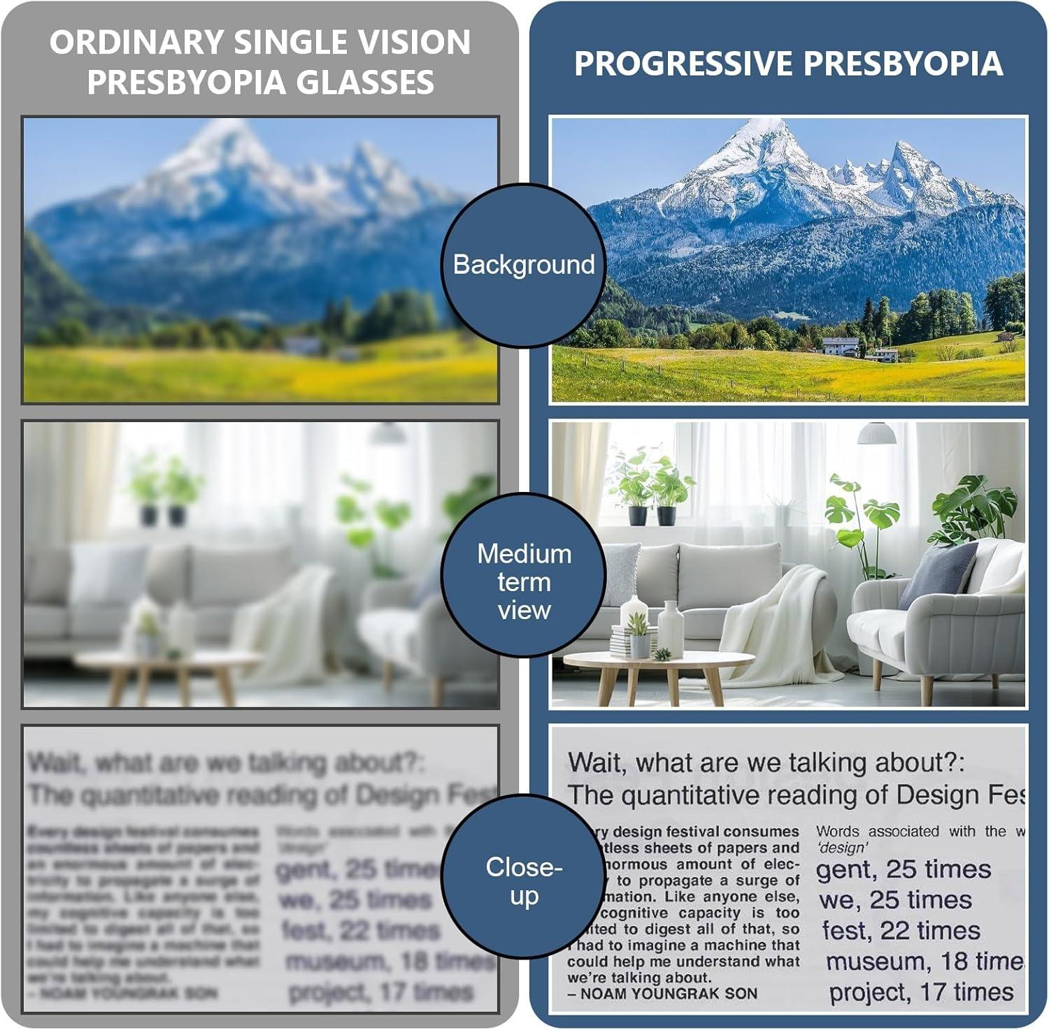 Smart Progressive Multifocal Reading Glasses: Experience ultimate visual clarity with intelligent progressive multifocal lenses. Combining three prescriptions in one, these multifocal reading glasses allow you to read, use a computer, and interact with others without constantly switching glasses